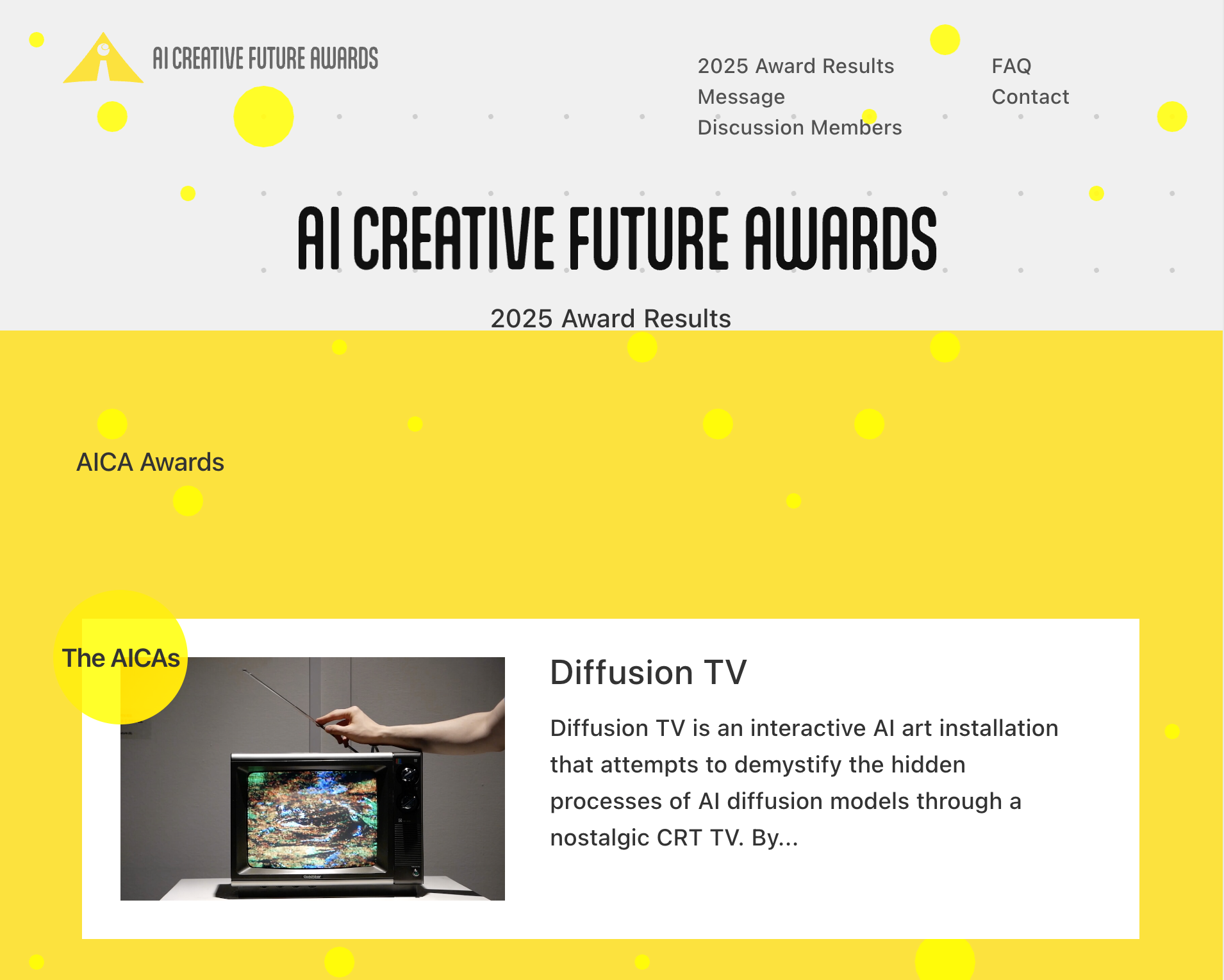 Diffusion TV has been chosen as an honoree for the AI Creative Futures Awards (AICA) 2025. AICA is a Japan-based award that celebrates AI-driven creative works, offering new perspectives on the future of creativity. The award ceremony took place in Tokyo on December 17, 2025 and was live-streamed on YouTube. Learn more at https://aica-awards.com/