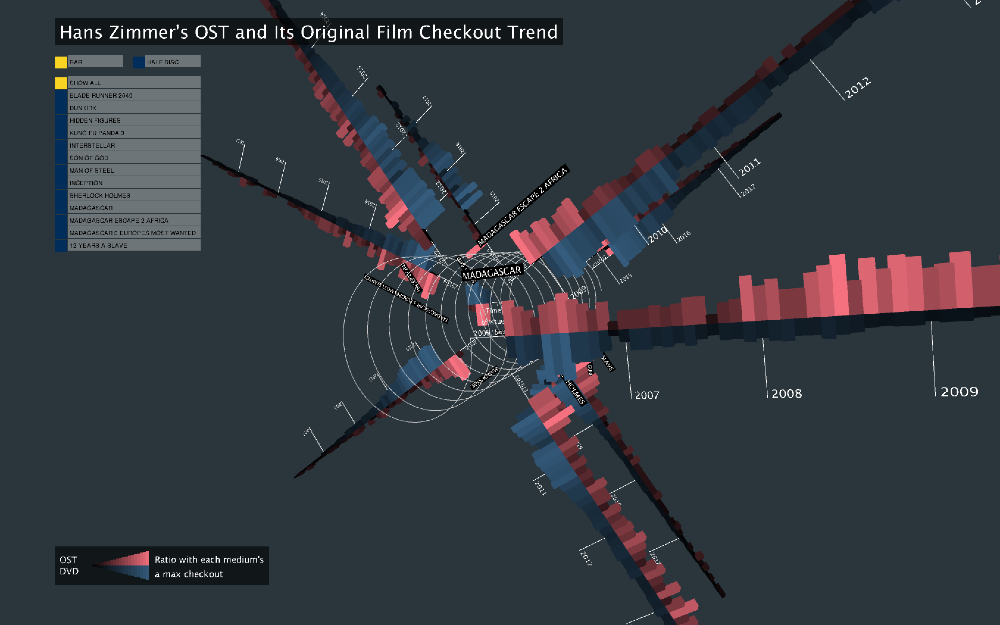 The main visual concept is to combine a circular timeline of an item's release date with a linear timeline of an item's checkout. This is because my main purpose in visualization is to see the trend of checkouts not its amount in detail since an item is issued and to compare the trend of two items, the OST and DVD of a film. For comparing two items, OST's trend is flipped in terms of the y-axis of a linear timeline, in other words, values reflecting checkouts, and placed DVD and OST's data together along with the x-axis of a linear timeline. And a film's checkout timeline starts at a certain point of a circular timeline which means the earliest released date among the film's OST and DVD. The length of an arc from the point of a released date to the end of a circular timeline is the same with the length of each film's linear timeline from the point.