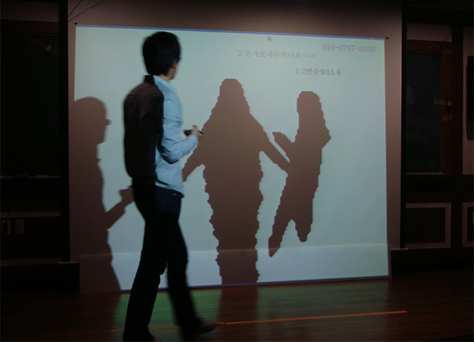 An interactive wall is often preferred as an alternative digital media art because of interaction and communication between artwork on the wall and viewers in a public space. However, this interactive wall has limitations that viewers could just participate in this when they are in a specific room which this system installed and just share their experiences through a social networking platform. In this project, we suggest a networked interactive wall that connects separate walls with a P2P system. At this wall, users could send people in different areas a mobile message and play a cooperative game by using a silhouette interface simultaneously. This makes remote partners communicate and interact in computer-mediated communication areas.